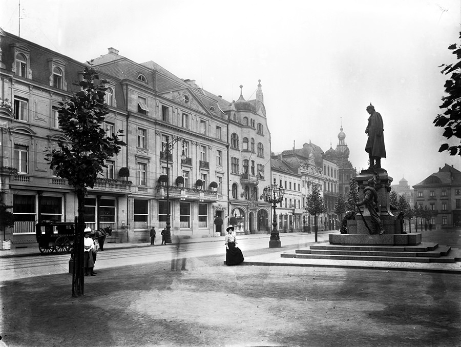 Dominierend im rechten Vordergrund steht das Kaiser-Wilhelm-I.-Denkmal. Es wurde 1896 enthüllt und war lange Zeit ein markanter Orientierungspunkt in der Düsseldorfer Innenstadt, bevor es im Zweiten Weltkrieg eingeschmolzen wurde.
