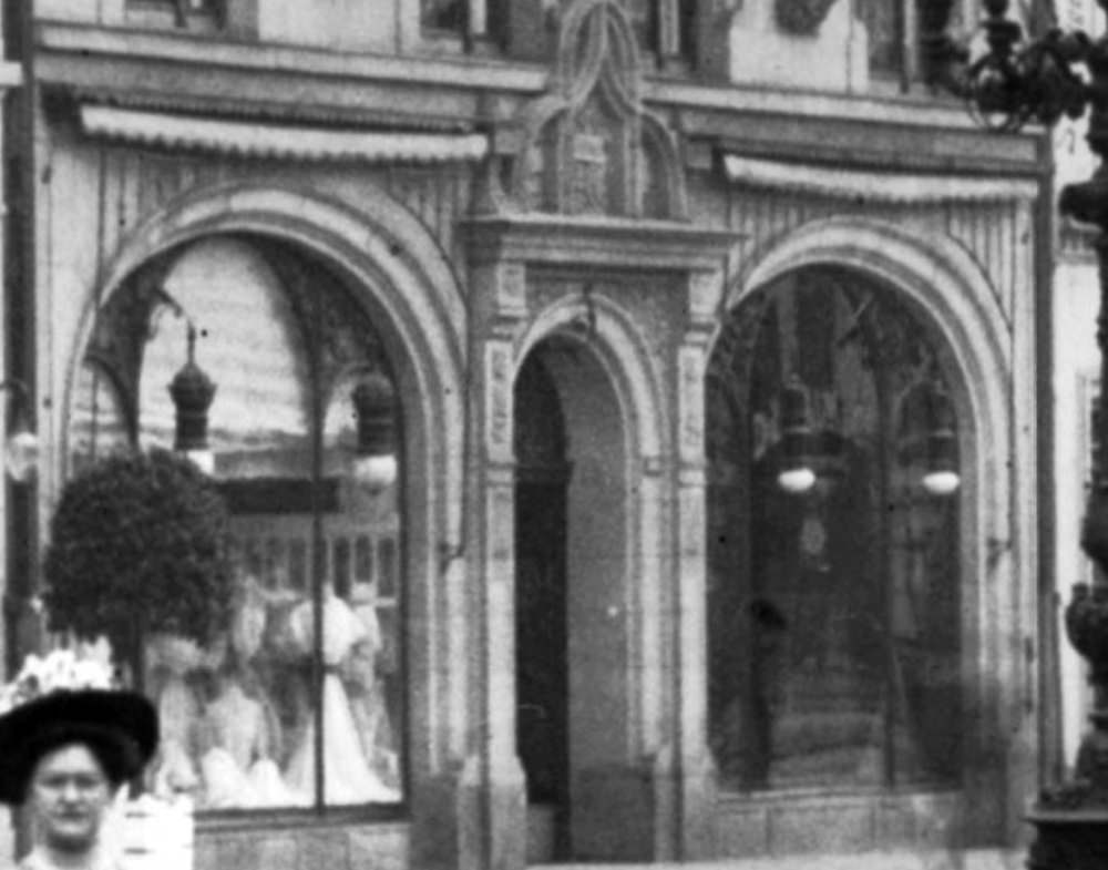 Die filigranen Rundbögen und die aufwendige Ornamentik über dem Eingangsbereich bildeten eine harmonische Einheit mit den prächtig dekorierten Schaufenstern.