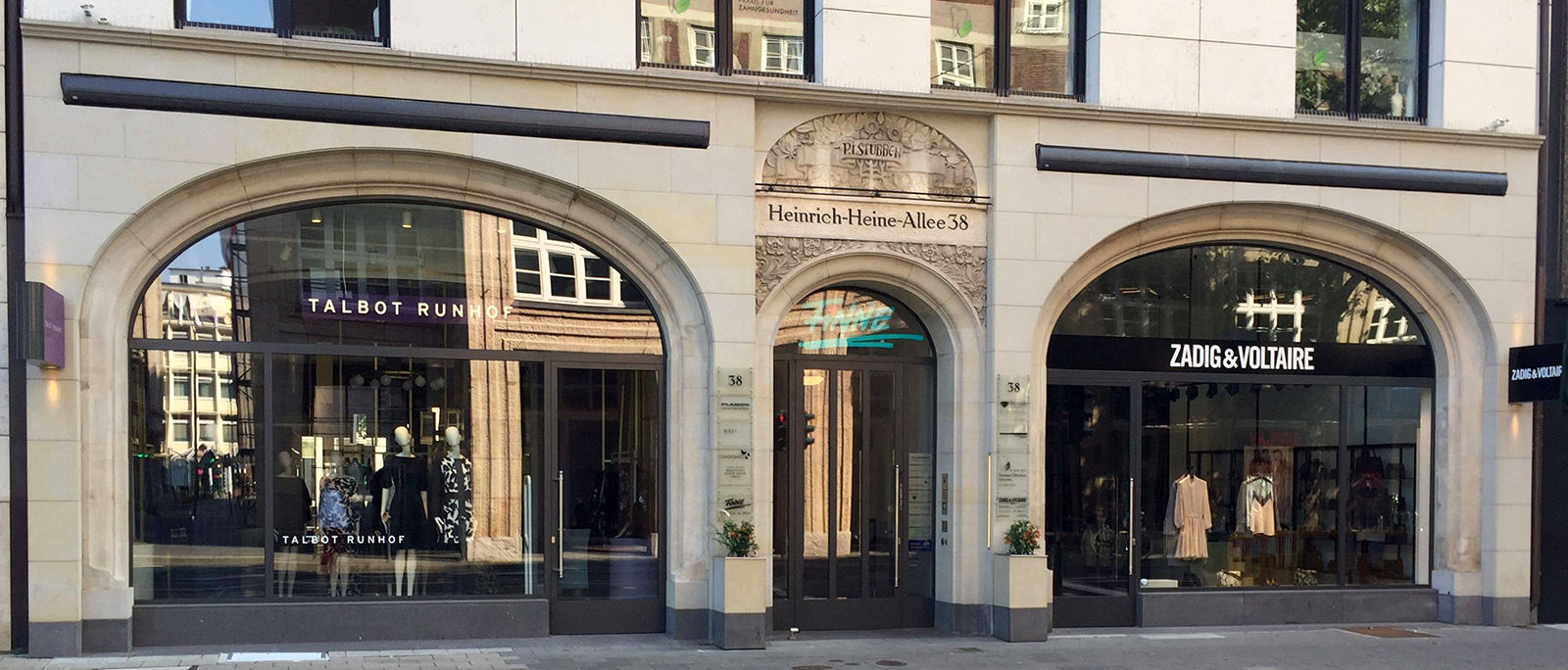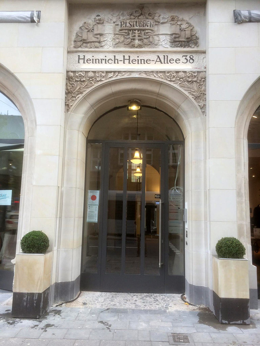 Die städtebauliche Bedeutung der Heinrich-Heine-Allee 38 wird besonders beim Blick durch den Säulengang des gegenüberliegenden Wilhelm-Marx-Hauses deutlich.