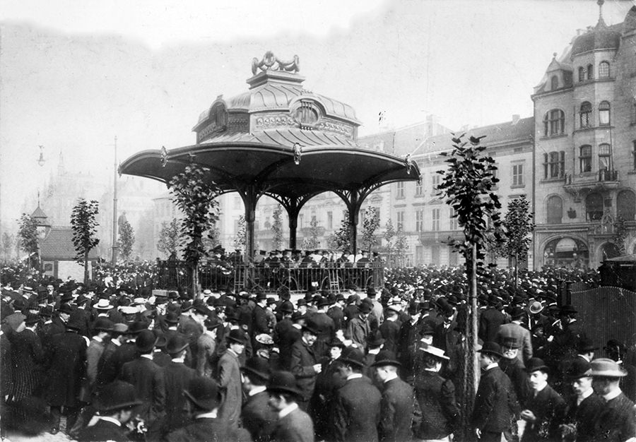 Eine seltene Aufnahme zeigt ein Platzkonzert im Herzen Düsseldorfs. Im kunstvollen Musikpavillon spielt das Orchester der Rheinbahn auf, umringt von hunderten Zuhörern.